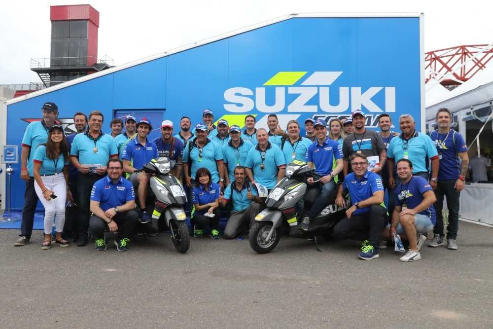 En el marco del campeonato del mundo de motociclismo MotoGP, Suzuki Motos de Argentina estuvo presente en Termas de Rio Hondo acompañando al Suzuki Ecstar Team en lo que fue su segunda carrera del año. El grupo lo integraron los 25 concesionarios de la red de dealers, como así también sus aliados estratégicos de la marca japonesa: YPF Elaion, Radikal Motocross y Go Pro de Argentina. Junto a los 4 ganadores del concurso «viví el MotoGP desde adentro con Suzuki», disfrutaron de un fin de semana a pura velocidad conociendo las intimidades del Team y los diferentes proveedores que hacen al gran circo del motociclismo mundial. Hubo acceso a palcos de inigualables vistas y atención personalizada, hasta un almuerzo compartido junto a los integrantes del Team (Alex Rins #42 y Joan Mir #36 incluidos). El fin de semana acompaño con un clima inmejorable donde hubo espacio para poder que los fanáticos puedan pedir autógrafos en posters, gorras o algún elemento que ellos deseen. Siendo el Autódromo un lugar de largas extensiones para caminar todo el tiempo, Suzuki Motos de Argentina preparó una serie de scooters lookeados especialmente para la ocasión para la mejor comodidad de los integrantes del equipo y sus pilotos. De esta manera pasó otra fecha más del MotoGP y otro año, donde Suzuki Motos Argentina posibilitó el acercamiento entre sus socios y el gran evento mundial de las 2 ruedas.