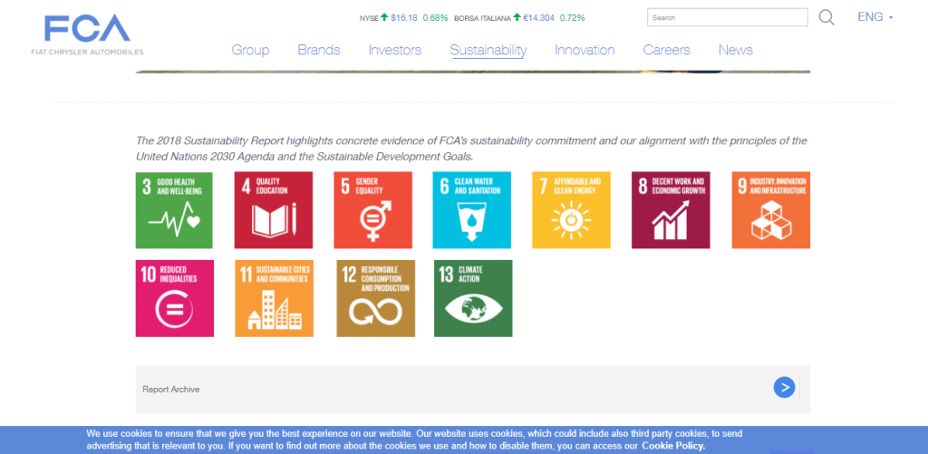 En 2018, FCA continuó transformando sus compromisos de sostenibilidad en acciones concretas con el propósito de crear, de modo responsable, un valor a largo plazo. Es consciente del efecto que sus actividades y productos tienen en la sociedad y el ambiente, así como de su papel en el desarrollo de soluciones para reducir la huella ambiental. Opera de manera responsable para contribuir a las Metas de Desarrollo Sostenible (ODS) brindando soporte a la Agenda 2030 de la Organización de las Naciones Unidas. El FCA Sustainability Report 2018 (Informe de Sostenibilidad FCA), emitido días atrás en la Asamblea General Anual de Accionistas, comunica a los stakeholders los logros sociales, económicos y ambientales más relevantes y los objetivos alcanzados por el Grupo. En el 2018, FCA entregó 4,8 millones de vehículos a clientes en todo el mundo, a la vez que continuó reduciendo la huella ambiental de sus operaciones. Durante los últimos ocho años, ha reducido las emisiones de CO2 en un 27%, consumo de agua en un 38% y generación de residuos en un 62% por vehículo producido en sus plantas. El grupo ha enfocado sus actividades en la sostenibilidad, y solo el año pasado recabó más de 2,4 millones de sugerencias de empleados en todo el mundo sobre potenciales mejoras en productos y procesos. Continúa empleando sus esfuerzos para desarrollar vehículos de modo responsable a través de transmisiones eficientes, tecnologías de electrificación, aerodinámica mejorada, reducción de peso, seguridad y calidad del vehículo. El 1º de junio de 2018, el Grupo divulgó el plan de negocios 2018-2022 con enfoque en el desarrollo tecnológico: conducción autónoma, despliegue de conectividad y electrificación de vehículo. En 2018, lanzó versiones híbridas de bajas emisiones del Jeep Wrangler 2018 totalmente nuevo y el Ram 1500 2019 también totalmente nuevo. Además, en el 2019 Geneva International Motor Show presentó las versiones híbridas “plug-in” (cargables en tomacorrientes) del Jeep Renegade y Compass y los coches concepto electrificados Alfa Romeo Tonale y Fiat Concept Centoventi. FCA continuó su colaboración con Waymo, la compañía de coches de conducción autónoma de Google, anunciando un contrato para agregar hasta 62.000 minivans Chrysler Pacifica Hybrid a la flota de conducción autónoma de Waymo. Las actividades enfocadas en la comunidad reflejan el esfuerzo en la promoción de sociedades prósperas y resilientes. En el 2018, FCA destinó recursos a la caridad por un valor aproximado de 24 millones de euros en todo el mundo. Los empleados actuaron como voluntarios en todo el mundo por más de 174.000 horas durante la jornada laboral para brindar soporte a proyectos sociales. Para conocer más sobre la jornada de sostenibilidad de FCA se puede ver el video 2018 (más abajo) Sustainability Highlights (en Destaques en Sostenibilidad 2018) o leer el 2018 Sustainability Report (Informe sobre Sostenibilidad 2018) en la sección dedicada de fcagroup.com (https://www.fcagroup.com/en-us/sustainability/pages/reporting.aspx).