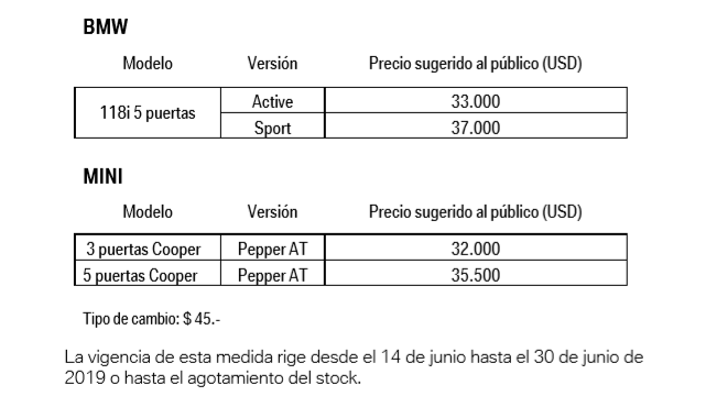 En el marco del Plan “Junio 0km”, BMW Group de Argentina comunicó los precios sugeridos al público de los modelos de las marcas BMW y MINI alcanzados por este programa, se trata del BMW 118i 5 puertas y del MINI Copper tanto tres como cinco puertas. La vigencia de esta medida rige desde el 14 de junio hasta el 30 de junio de 2019 o hasta el agotamiento del stock. Estos son los valores: