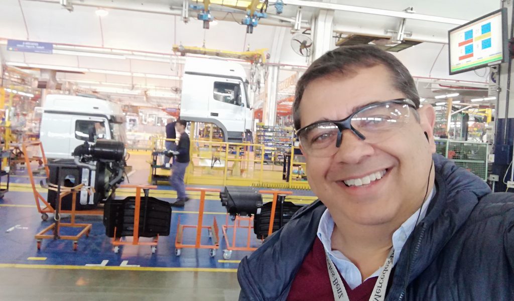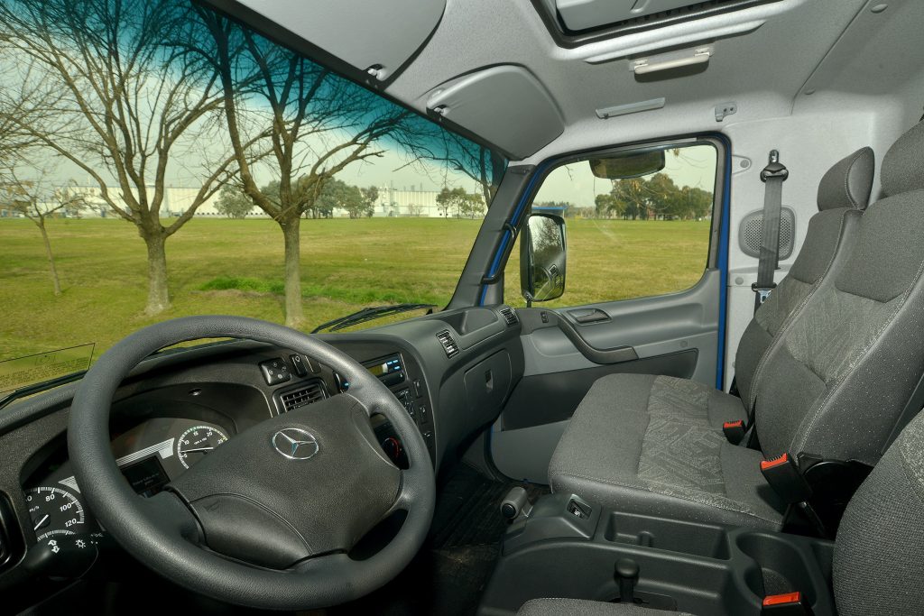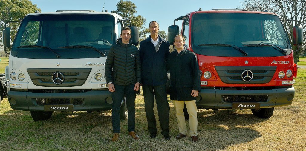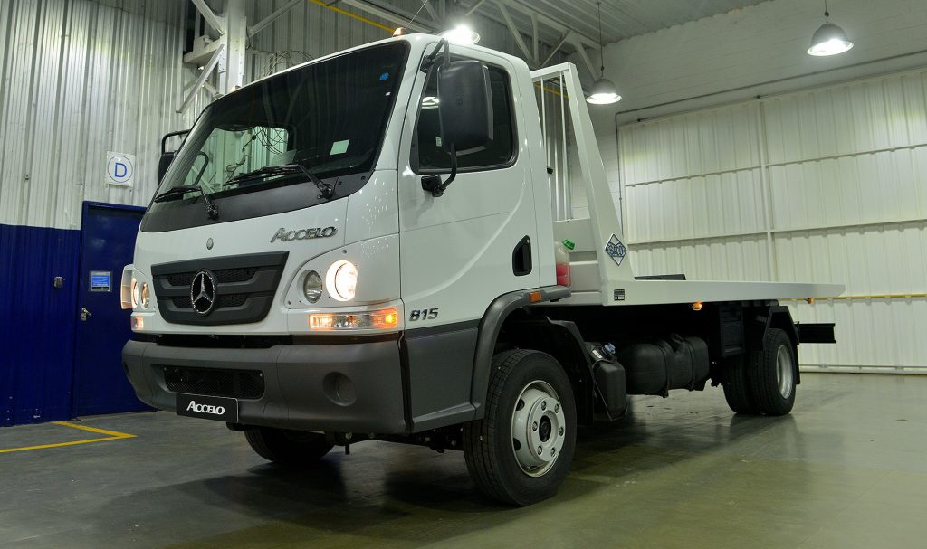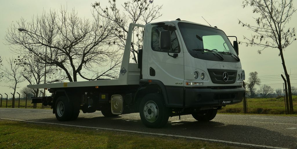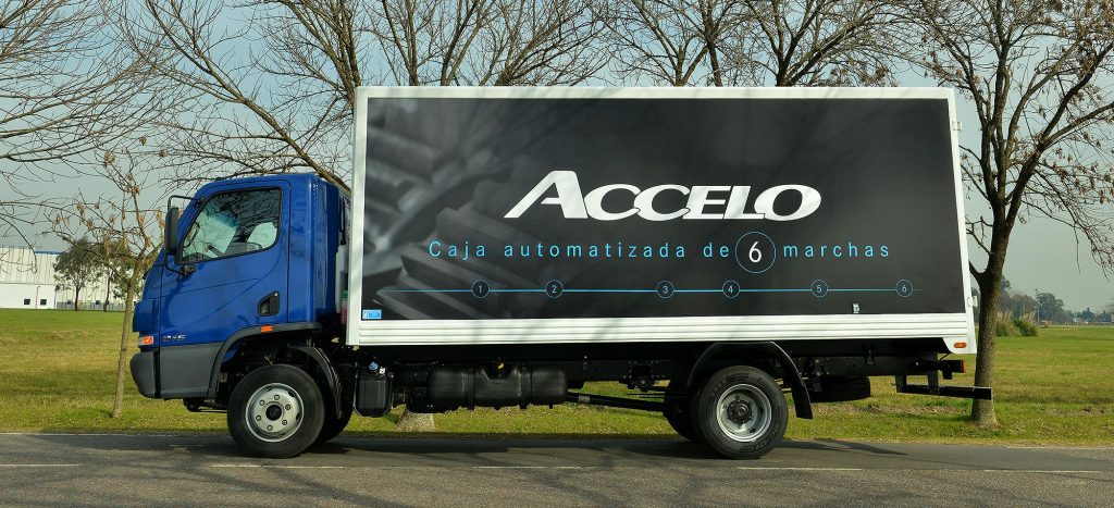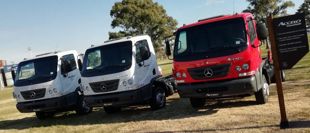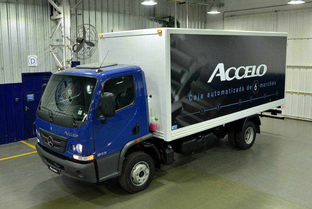 La empresa Mercedes-Benz convocó a la prensa especializada a su centro industrial Juan Manuel Fangio ubicado en la ciudad bonaerense de Virrey del Pino donde pudimos visitar las líneas de montaje de camiones y buses de la estrella; conocer la línea de cajas y motores remanufacturados Reman; e informarnos y probar a su última novedad de la firma en el segmento del transporte: el camión Accelo, tanto 815 como el 1016, con caja automática robotizada que se produce en el Brasil y que se complementa con la gama de los Aceelo nafteros producidos en la Argentina con los cuales la automotriz viene liderando el segmento de los camiones livianos. Como novedad ambas versiones del Accelo poseen una cabina extendida, que ofrece mayor espacio y confort para el conductor; un nuevo asiento neumático para el conductor; y una nueva distancia entre ejes, que permite una mayor longitud carrozable. La versión automatizada trae una caja de 6 marchas (una marcha adicional respecto a la versión manual del Accelo). La nueva caja cuenta con dos modos de conducción: Eco (conducción económica) y Power (para condiciones de exigencia). Por otra parte, el pedal del acelerador incorpora la función de Kick-down al final del recorrido del pedal, y el nuevo asistente de arranque en pendiente (HSA) mejora la seguridad al iniciar un nuevo recorrido manteniendo el freno activado hasta que el conductor comience a acelerar el camión. Como punto fuerte en cuanto a lo que es eficiencia y flexibilidad, la nueva caja de 6 marchas posibilita una mejor utilización del torque del motor ofreciendo un mejor desempeño y consumo de combustible. El nuevo escalonamiento de marchas ofrece una primera marcha más reducida, proporcionando mejores arranques y mayor agilidad en tráfico urbano y la misma relación en la sobremarcha, por lo que se mantiene la misma velocidad final. La selección automatizada de marchas se realiza en función de la carga y la inclinación del vehículo, evitando el error humano y reduciendo el riesgo de reparaciones por mal uso del camión. La caja viene preparada para montaje posterior de una toma de fuerza en aquellas aplicaciones que así lo requieran. El nuevo Accelo automatizado ofrece mayor robustez, ya que esta caja fue diseñada para un uso urbano con alta frecuencia de cambios de marcha y cuenta con: carcasa de aluminio para un menor peso final del camión (menor tara y mayor carga útil), anillo sincronizador de fibra de carbono para menor desgaste de los componentes que operan en la sincronización de marchas y en consecuencia mayor vida útil, protección de exceso de rotación de motor (rotación máxima 2.780 rpm) y de sobrecarga de embrague. Por su parte, la nueva cabina extendida que poseen ambas versiones, con 180 mm extra por detrás de los respaldos de los asientos, aumenta el confort y la capacidad de movimiento del asiento del conductor incorporando a su vez tres gavetas y una red portaobjetos (32 litros extra de espacio de guardado). Además, se incorpora de serie el asiento neumático para el conductor, permitiendo nuevas posiciones de ajuste longitudinal, en altura e inclinación. Su nuevo panel de instrumentos posee un diseño moderno, de fácil lectura y amigable para la navegación. En cuanto a la seguridad, se agrega el sistema ASR (control de tracción) que reduce la pérdida de adherencia de las ruedas, evitando que patinen, ya sea por un exceso de aceleración o porque la calzada esté resbaladiza. Con la incorporación de este sistema se completa el paquete de seguridad del Accelo que incluye: ABS (Antibloqueo de Frenos), EBD (Repartición electrónica de la fuerza de frenado) y ASR (Control de Tracción). Entre las principales características del Accelo, se destaca la eficiencia del producto. Esto se debe a la nueva distancia entre ejes de 3.900 mm que favorece el largo carrozable.