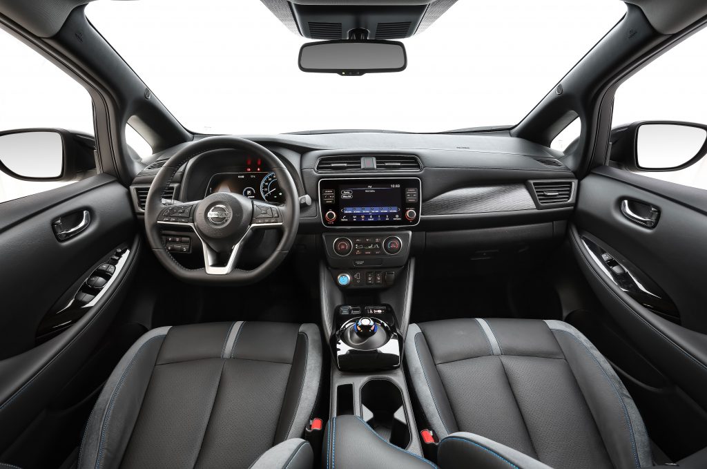 El Nissan Leaf incorpora una batería de ion-litio de 40kWh, capaz de otorgar una autonomía de 389 km en ciclo urbano de acuerdo con el índice WLTP* (270 km en ciclo combinado). El motor 100% eléctrico entrega una potencia de 110 kW (147 hp) y un torque de 320 Nm, lo que resulta en una aceleración de 0 a 100 km/h en 7.9 segundos. Cuenta con tres tipos de conducción: el primero es Modo Eco que ayuda a controlar el desempeño del motor para ahorrar energía. El segundo es el Modo B que aplica una frenada regenerativa más contundente y recarga la batería sin comprometer la potencia del auto. El último es el Modo D, el modo normal de conducción con la salida máxima de motor. El vehículo eléctrico líder de ventas a nivel mundial proporciona una conducción estable y segura gracias a su bajo centro de gravedad, excelente maniobrabilidad, bajas vibraciones y un manejo más silencioso en comparación con un vehículo con motor impulsado por combustible. En el exterior, el Nissan LEAF muestra una estética elegante con líneas dinámicas que refuerzan su estilomoderno y tecnológico. El diseño distintivo de Nissan se destaca por los faros en forma de boomerang con luces LED y la parrilla frontal “V-motion”. El color azul claro, presente en la superficie de la parrilla, emblemas laterales y traseros Zero Emission y en el marco de la defensa trasera, hace alusión a que el modelo es parte de la familia de vehículos eléctricos de Nissan. Otros elementos característicos del exterior del Nissan LEAF son los faros anti niebla, espejos laterales con luces direccionales integradas, techo flotante, alerón trasero con luz de frenado, difusor trasero y llantas de aleación de aluminio de 17 pulgadas. El interior del Nissan LEAF es espacioso y altamente funcional, influenciado por el lenguaje de diseño «Gliding Wing» de Nissan en el panel frontal. La cabina del Nissan LEAF se destaca por acentos en color azul, los cuáles son un símbolo de los vehículos eléctricos Nissan. Asimismo, cuenta con un volante en forma “D” forrado en cuero, con controles de audio y crucero inteligente; así como con una pantalla de 7 pulgadas en el tablero que brinda información al conductor. El nuevo Nissan LEAF tiene un equilibrio ideal de comodidad y estilo, ya que ofrece una consola de sistema de audio con pantalla frontal de 8 pulgadas, 6 parlantes, y compatibilidad con Apple Carplay y Android Auto. El hatchback eléctrico ofrece espacio para cinco pasajeros y una cómoda capacidad de carga en su baúl de 435 litros que se expande cuando la segunda fila de asientos se reclina en la posición 60/40.