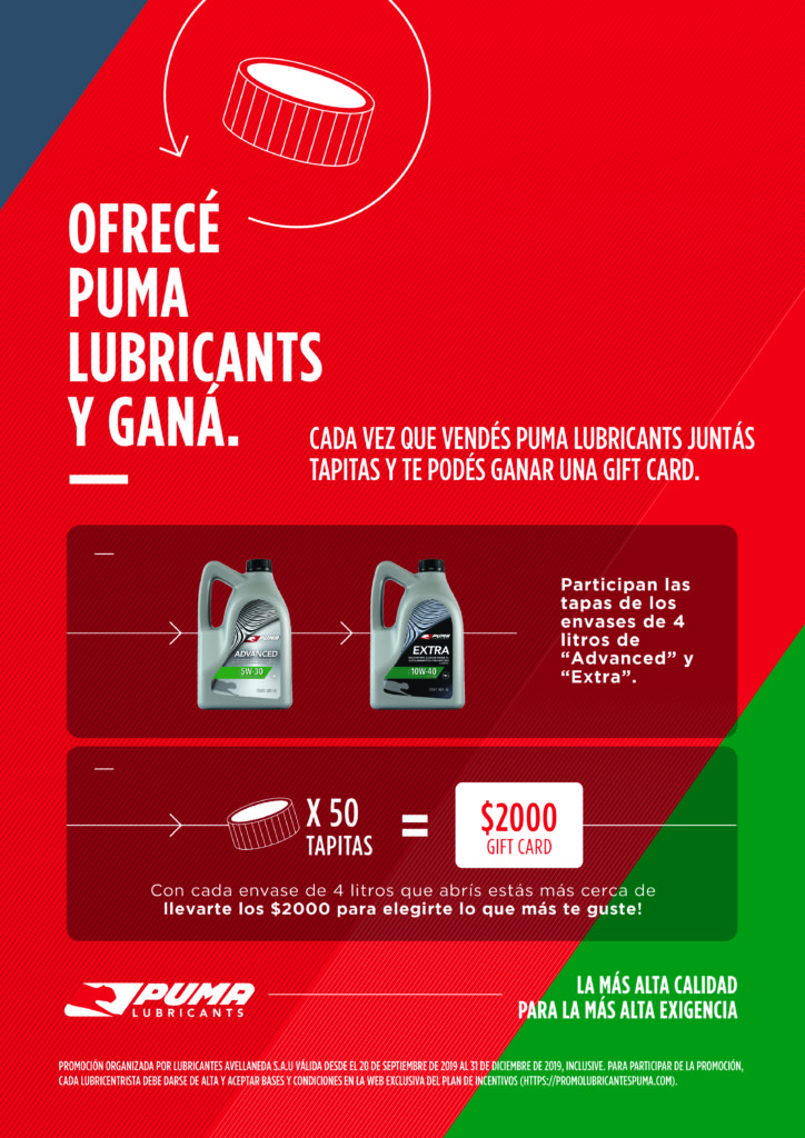 Puma Energy lanzó su plan de incentivo destinado a Lubricentros, un programa de estímulo cuyo objetivo consiste en impulsar el desembarco de una nueva línea de lubricantes que representará una novedad para el mercado local. Este proyecto, que se hallará vigente hasta el 31 de diciembre de 2019 inclusive, se enfocará en el rubro lubricentro, una cuestión central en lo que refiere al desarrollo comercial de la compañía a nivel nacional. Esta promoción es dedicada exclusivamente a lubricentristas y distribuidores. Los interesados sólo deberán ingresar a la página web (www.promolubricantespuma.com) para inscribirse y darse de alta. Los dueños de los lubricentros adheridos al Plan de Incentivo tendrán que juntar tapitas de envases de cuatro litros (se desestimarán las demás) que conseguirán a través de los cambios de aceite con la mercadería Puma. De esta manera, cada cincuenta tapitas recolectadas en total, la persona gestora del lubricentro participante se encontrará en condiciones de solicitar la Gift Card en formato digital de $ 2000.- La firma -que enviará previamente el kit para guardar dichas tapitas-, se encargará de facilitar la operación y retirará la caja correspondiente al momento de canjearla. “El espíritu de Puma Energy se caracteriza por el deseo de ser socio de los lubricentristas, por eso implementamos esta idea. Queremos que logren concentrarse únicamente en la venta”, señaló al respecto Alejandro Barón, gerente de Marketing de la compañía. Cabe aclarar que la empresa expuso por primera vez sus productos “Puma Lubricants, formulados en Suiza y producidos en su planta de Avellaneda, en marzo de este año. “Estos artículos cumplen con los más altos estándares de calidad y abarcan cada uno de los segmentos de aplicación: automotriz, motos, transporte, agro, industrias y naval”, explicó Barón. En función a lo anterior, los aceites fabricados por esta petrolera abastecen en la actualidad a la terminal Honda para todos los servicios de posventa en el mercado argentino.