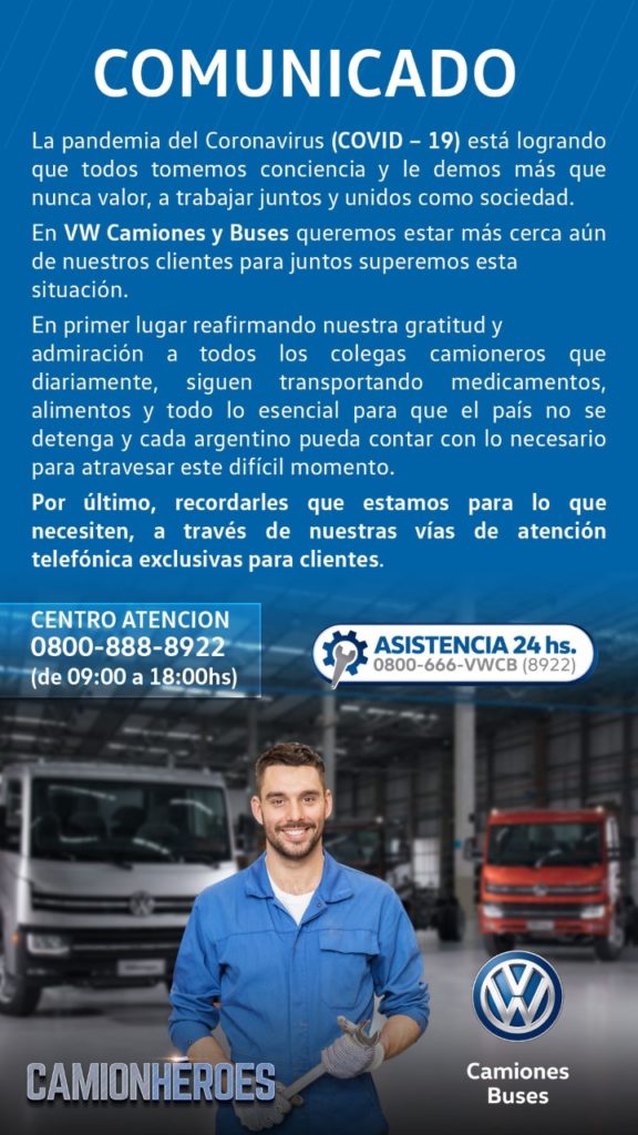 La división Camiones y Buses de Volkswagen informó que su red de concesionarios se encuentra operativa en todo el país prestando servicios de emergencia a puertas cerradas para atender los requerimientos de sus clientes que hoy cumplen un rol fundamental para el transporte. Con el objetivo de cuidar de la salud pública, en los concesionarios de la marca alemana priorizan el mantenimiento y reparaciones de unidades que presten servicios y/o trasladen elementos de primera necesidad. Para ello, la empresa dispone de 2 niveles de atención: desde la terminal a través del servicio de Asistencia Técnica 24hs: 0800-666- WCB (8922) , o desde centro de atención al cliente de la marca VW (0800- 888-8922); y desde los teléfonos de emergencia de cada concesionario. Estos canales permiten cumplir con el objetivo de responder rápidamente, acompañando la actividad del transporte en estas circunstancias. “Volkswagen asume la responsabilidad de ser un actor clave dentro del mundo del transporte, y de otórgale a nuestros clientes el nivel del servicio que se necesita para que el país no frene y que el resto de las personas, tal como propone el aislamiento, se puedan quedar en casa”, destacó Federico Ojanguren , gerente general de VW Camiones en la Argentina.