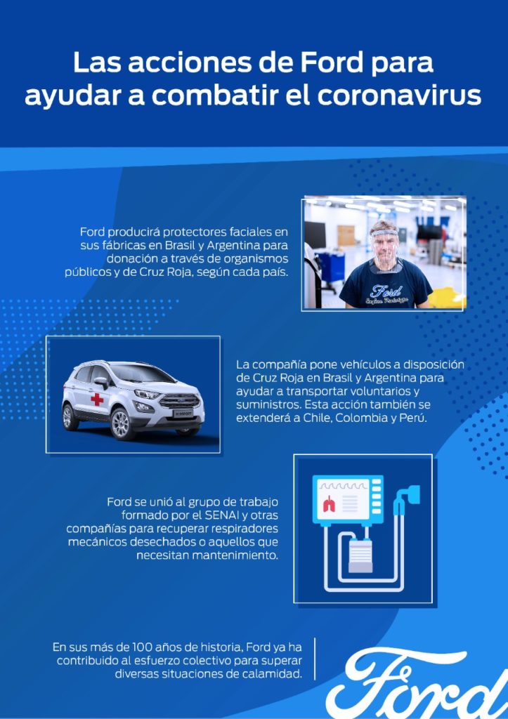 Con el fin de ayudar a combatir la pandemia de coronavirus, Ford anunció que inicialmente producirá 50 mil protectores faciales en sus instalaciones de Camaçari en Bahía, Brasil, y en las de Pacheco, en Argentina, para equipar a profesionales de la salud que trabajan en la primera línea tratando pacientes que contrajeron el virus. Los protectores faciales, fabricados con láminas de acetato y piezas de soporte, son parte del equipo esencial de protección personal que necesitan los profesionales de la salud en este momento. La distribución en los puntos de servicio a trabajadores de la salud se coordinará a través de los Departamentos Municipales de Salud y de Cruz Roja, según cada país. La amplia experiencia de Ford en diseño, cadena de suministro, fabricación y logística fueron esenciales para la creación, en tiempo récord, de una línea de producción para estos protectores faciales. Esta tarea será realizada única y exclusivamente por voluntarios, mientras se respetan el distanciamiento social, las pautas de protección para el cuidado y la salvaguardia de higiene personal y del lugar de trabajo. “La familia está en el primer lugar de los valores de Ford y lo ha estado por más de 100 años. Nuestro deseo de ayudar y cuidar a las personas es una parte integral de nuestra tradición. En estos tiempos difíciles, nuestras acciones se vuelven aún más importantes», dice Lyle Watters, presidente de Ford Sudamérica. Esta iniciativa forma parte de una serie de acciones que se están implementado por la empresa en Brasil y Argentina para hacer frente a los retos que todos enfrentamos en esta situación sin precedentes. En Brasil, Ford se unió al grupo de trabajo formado por CNI / SENAI (Servicio Nacional de Aprendizaje Industrial) y a otras compañías para restaurar respiradores artificiales mecánicos, que han sido descartados o necesitan mantenimiento. Este equipo es crítico en el tratamiento de algunos pacientes con Covid-19. Además, la compañía está poniendo vehículos a disposición de Cruz Roja en Brasil, Argentina, Chile, Colombia y Perú para ayudar en el trabajo con el transporte de equipos y suministros. La flota incluye los modelos Ranger, Transit, Fusion, EcoSport y Ka, así como también, una ambulancia. En Brasil, con el fin de ayudar a los consumidores que han financiado sus vehículos a través de Ford Credit, la compañía también anunció la posibilidad de posponer hasta tres cuotas del financiamiento hasta el final del contrato. «Ford Sudamérica está comprometida con la seguridad y la salud de sus empleados y colaborará con los esfuerzos para combatir esta pandemia y su impacto sin precedentes en todos los aspectos de la vida social y económica», agrega Watters.