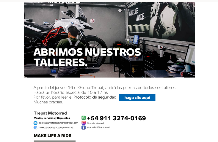 Tras abrir los talleres para la atención de los vehículos exceptuados para poder circular durante la cuarentena, los concesionarios de la red del Grupo BMW Argentina están informando a sus clientes que todas las unidades correspondientes a las marcas BMW, MINI o Motorrad tienen una ampliación de las garantías hasta 30 días posteriores de finalizada la cuarentena. Es decir que aquellas unidades que en el período comprendido entre el 20 de marzo y el 10 de mayo de este año hayan quedado fuera de garantía, gozarán de una extensión de la cobertura hasta el 10 de junio del 2020. En caso de haber modificaciones en las medidas anunciadas como vigentes, estas se adecuarán a la fecha oficial de finalización del aislamiento establecido. Por decisión los ejecutivos que manejan los concesionarios de las marcas BMW, MINI y Motorrad, fueron los primeros en abrir los talleres premium en peno aislamiento y lo siguen haciendo con estrictas medidas de seguridad, con horarios reducidos y sólo con turnos previos obtenidos vía online. En esta dirección de web podes contactarte de la red de automotriz germana: BMW y MINI: https://www.bmw.com.ar/es/concesionarios.html; Motorrad: https://www.bmw-motorrad.com.ar/es/public-pool/content-pool/dealerlocator.html.
