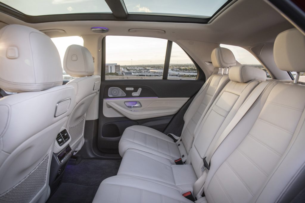 En comparación con su antecesor, el nuevo GLE se distingue por una batalla considerablemente más larga (2.995 mm, aumento en 80 mm). Este incremento se traduce en una mayor amplitud interior, especialmente para los ocupantes de las plazas traseras. También ha mejorado la sensación de espaciosidad, así como el confort de acceso a la primera fila de asientos. También es posible abatir el respaldo trasero completo. Al igual que sucede en el modelo antecesor, es posible colocar tres asientos infantiles en paralelo en la segunda fila de asientos. Las plazas traseras disponen de puntos de fijación i‑Size/ISOFIX. El volumen del baúl asciende a un máximo de 825 litros por detrás de los asientos traseros, y a un máximo de 2.055 litros con los respaldos de la segunda fila de asientos abatidos. El acceso al habitáculo desde el baúl es ahora 72 mm más ancho, lo que facilita el transporte de equipaje voluminoso. El nuevo GLE es un refugio de serenidad y tranquilidad. Su habitáculo define un nuevo estándar en su categoría por la ausencia casi absoluta de ruidos y vibraciones. Además, Mercedes-Benz ha optimizado y armonizado siempre las cerraduras y las puertas de sus vehículos de modo que, al cerrarlas, se obtenga una sonoridad típica.