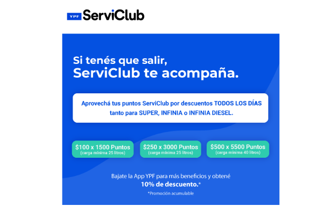 Manteniendo los protocolos de seguridad y atendiendo a aquellos que poseen el permiso de libre circulación, la empresa YPF extiende durante junio los beneficios para los socios Serviclub. Así lo hizo saber a través de un envío de mail directamente a sus asociados. Se trata de aquellas promociones vinculadas con la carga de combustible súper, Infinia e Infinia Diesel; el mantenimiento en Boxes y el delivery de comidas. Dependiendo el caso, hay descuentos hasta $ 500 y, a la vez, la posibilidad pagar canjean puntos acumulados con la Serviclub. La petrolera informó también que hace descuentos para quienes ya utilizan la app de la empresa en el celular.