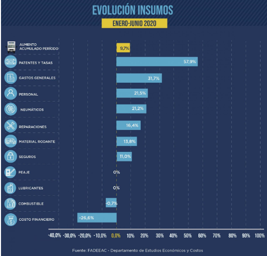 Con varias ramas del sector del transporte de cargas trabajando aún por debajo de su capacidad operativa y otras totalmente paradas a raíz de la emergencia sanitaria, el primer semestre acumula un aumento del 9,7% en los costos del transporte de carga. Los rubros que lideraron los aumentos durante la primera mitad del año fueron patentes y tasas junto a gastos generales. Según el Departamento de Estudios Económicos y Costos de la Federación Argentina de Entidades Empresarias del Autotransporte de Cargas (Fadeeac) el mes de junio tuvo un aumento para el sector del 0,64%, en línea con la tendencia a la desaceleración de los meses previos (1,7% y 1,3% en abril y marzo, respectivamente). De esta manera, el total acumulado en estos primeros 6 meses del 2020 fue del 9,7%, apenas por debajo de los dos dígitos en un contexto de caída de la actividad como consecuencia de la pandemia. Los datos surgen del Índice de Costos del Transporte Fadeeac (ICTF) elaborado mes a mes por la federación y que mide 11 rubros que impactan directamente en los costos de las empresas del transporte de cargas de todo el país. La metodología del índice fue verificada por el Centro de Investigación en Finanzas de la Universidad Torcuato Di Tella (UTDT) a partir de datos primarios y una estructura de costos obtenidos de manera independiente por la Federación. En el primer semestre de 2020, el ICTF experimenta una nítida desaceleración de sus costos respecto del año 2019, aumentando prácticamente la mitad de lo registrado en igual período del año anterior donde entre enero y junio el aumento fue del 18,3%. Durante este periodo, lideraron los incrementos de costos las patentes (57,9%), los gastos generales (31,7%), el personal (21,5%) y los neumáticos (21,2%). En tanto el combustible se ha mantenido prácticamente sin cambios (-0,7%) al tiempo que el costo financiero presenta un importante descenso (-27%) en el semestre, en el marco de las fuertes bajas de las tasas de interés como factor contracíclico al notorio deterioro en la cadena de pagos que están sufriendo las empresas, dada la caída de la actividad. “Si bien por lógicas razones los costos han aumentado menos comparado con el mismo periodo que el año anterior, el sector atraviesa una situación muy delicada: aún con relativa libre circulación la actividad cayó un 30% y estimamos que el 30% del sector va a desaparecer para cuando haya terminado la crisis derivada de la pandemia”, aseguró Martín Borbea Antelo, secretario general de FADEEAC. Durante junio lideraron los aumentos de costos los rubros gastos generales (15,74%), principalmente por los mayores costos asociados al COVID-19, y el costo financiero (12.56%), teniendo en cuenta la suba de las tasas de interés en el corriente mes. Por el lado de personal, muestra una disminución (-3,49%) que responde a la finalización de la asignación extraordinaria no remunerativa registrada en los meses de febrero a mayo inclusive. Neumáticos, en tanto, vuelve a exhibir un aumento destacado (4,42%) tras la fuerte suba del mes anterior (8,45%), en el marco de la aceleración de la política de minidevaluaciones del tipo de cambio oficial. Por otro lado, el combustible que, junto a personal representa las dos terceras partes de la estructura total de costos, casi no presentó variaciones respecto de mayo (-0,03%) y exhibe un descenso de 0,7% en el primer semestre. Finalmente, por el lado de los costos del equipo, material rodante y reparaciones muestran subas de 1,65% y 0,63% respectivamente. El resto de los rubros (lubricante, seguros, patentes y tasas, peajes), no ha sufrido modificaciones en relación con mayo 2020.