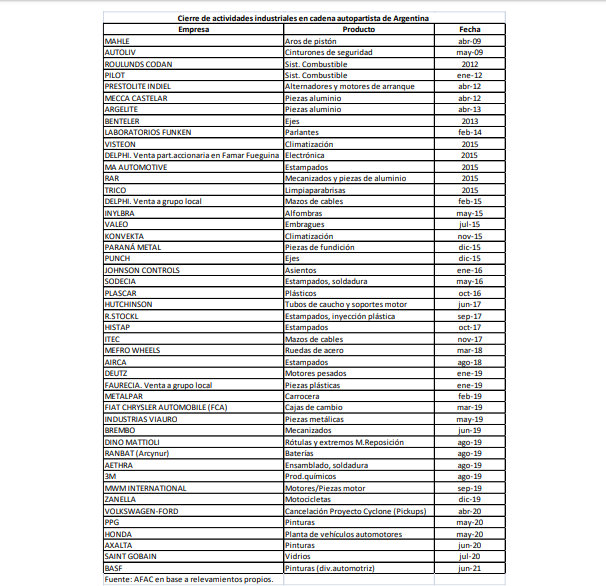 A través de un comunicado con el título “Que la Emergencia no Oculte la Decadencia”, la Asociación de Fábricas Argentinas de Componentes insta a la cadena de valor automotriz y a las autoridades a que se tome cabal conciencia de la gravedad en la que se encuentra el sector automotor de nuestro país, en particular el sector autopartista. En los últimos días han trascendido casos de empresas proveedoras que han decidido cesar total o parcialmente las actividades industriales en la Argentina. Nos preocupa sobremanera que se interprete que ello es el mero resultado de la coyuntura generada por la pandemia del Covid-19. Cerrar actividades fabriles en el sector automotor requiere procesos de decisión que llevan muchos meses, y a veces años. Entre el año 2009 y la actualidad, han cerrado actividades productivas unas 47 empresas de la actividad autopartista, 17 de ellas en 2019 y lo que va de 2020 (ver listado abajo). Existen múltiples factores que han sido determinantes en la generación de este proceso de cierres: La falta de estímulos y la inseguridad jurídica producida por el permanente cambio de las reglas de juego desincentivan los proyectos de inversión que se requieren para mantener una industria automotriz estructuralmente sólida y sustentable. Hay sobrados ejemplos de cambios normativos frecuentes e intempestivos en materia laboral, tributaria y financiera; como así también la inexistencia de una justicia que actúe de manera ágil, efectiva y sin interferencias. Altísima presión impositiva sobre etapas de producción en los tres niveles de gobierno. Por ejemplo, Ingresos Brutos grava autopartes locales y no lo hace con las importadas. Derechos de exportación que desincentivan ventas externas de alto valor agregado local y que excluyen de su base imponible las autopartes importadas. Reintegros que no se condicen con la realidad de la presión tributaria. Normas laborales rígidas y generadoras sistemáticas de contingencias judiciales. Costos laborales no salariales que perjudican tanto a empresas como a los equipos de trabajo. Convenios laborales arcaicos que en muchos casos datan de 1975 y dificultan trabajar de manera acorde a la productividad demandada por la actividad automotriz. Protección arancelaria efectiva negativa. El arancel promedio ponderado para las autopartes es del 6/7% mientras que para las materias primas es del 10/12% y para los moldes y matrices necesarios para los procesos de localización es del 35/28/14%%. Ello incita muy claramente a importar las autopartes. Escaso poder de influencia local sobre los procesos de decisión de las casas matrices sobre inversiones en un contexto de alta capacidad ociosa en la región. Abuso de posición dominante en el caso de algunos clientes. Muestra de ello, durante 2019 se solicitó a la Comisión de Defensa de la Competencia que iniciara una investigación al respecto en el caso de Renault y su relacionamiento con proveedores. El alto riesgo, parte por los vaivenes macroeconómicos y parte por la microeconomía de los proyectos en Argentina; y las relaciones comerciales cliente-proveedor, hace que la tasa de descuento para la evaluación de los proyectos de inversión sea entre un 40 y 70% superior en comparación con México y Brasil. Dificultad de acceso a la información técnica por parte del mercado de reposición independiente que genera mayores importaciones. En la Unión Europea es obligatorio la igualdad de acceso a toda la información con respecto al uso de un vehículo, sistema, componente, unidad técnica independiente, pieza o equipo. Escasa credibilidad sobre mecanismos de política sectorialprovocada por cambios en las reglas de juego cada vez que alguna empresa incumple, como fue el caso del Flex automotriz con Brasil. Avance de acuerdos de libre comercio automotor (Brasil, UE) y con reglas de origen insignificantes, sin que se haya siquiera empezado un trabajo profundo para mejorar la competitividad; ni la sistémica país, ni dentro del sector. Estos factores generan pérdida de producción, empleo, inversiones, menos exportaciones, más importaciones y un mayor desequilibrio comercial. Sin tener en cuenta los efectos de la pandemia, desde 2011 a diciembre de 2019 se perdieron 15 mil empleos directos en el autopartismo, cayendo todos los años con respecto al año anterior. Si bien es un indicador agregado que no refiere al nivel de integración local, el ratio importaciones de autopartes por vehículo producido pasó de 13.000 u$s en 2009 a 18.500 u$s en 2019. En los últimos 10 años el déficit autopartista osciló entre 4 mil y los 8 mil millones de u$s, dependiendo de la cantidad de vehículos producidos. Las exportaciones de autopartes que eran 2.500 millones de dólares hace 10 años, cayeron a 1.500 en 2019, el 40% menos. Nuestro país necesita de manera urgente revertir la situación de decadencia por la que atraviesa nuestro sector. La única salida será a través el crecimiento del agregado de valor a través de la inversión, generando empleo y el aumento de la productividad que haga posible la mejora de ingresos. Para dicho proceso de inversiones, resulta esencial el abordaje integral de las restricciones enunciadas de manera urgente. No será viable insertarnos en las cadenas de valor de las nuevas tecnologías y la electromovilidad si persisten las mismas condiciones que nos llevaron a la situación actual. Debemos atender las circunstancias de la emergencia. Pero no debemos perder de vista las verdaderas causas que han llevado al actual proceso de decadencia de la actividad automotriz de la última década.