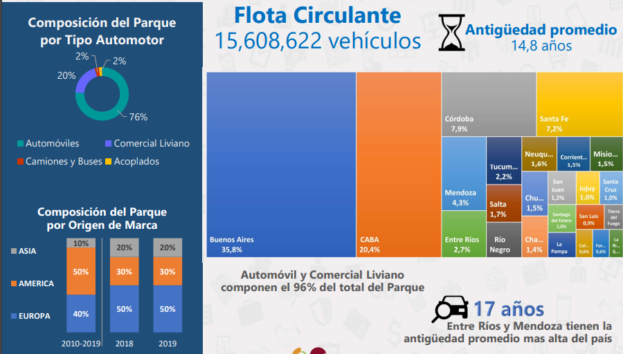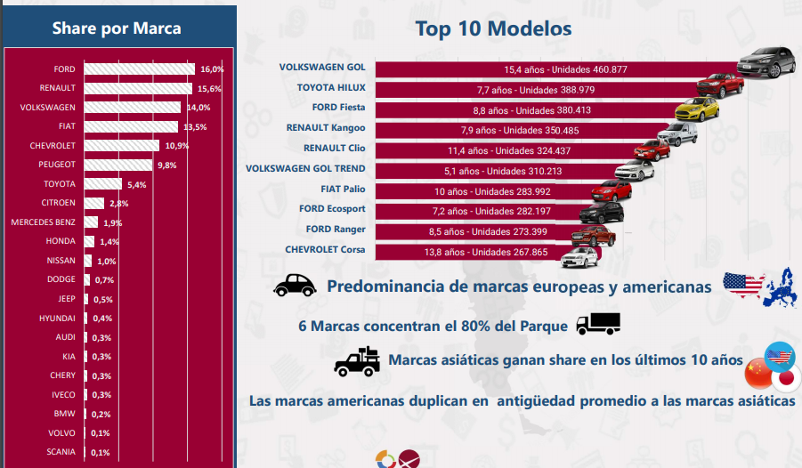 La entidad que agrupa a todos los concesionarios del país (Acara) nos hizo llegar un informe elaborado por Sioma sobre el actual parque automotor argentino. De este trabajo se desprende que existen 16.608.672 vehículos circulando y que representan un promedio de 14,8 años de antigüedad. El 80% del parque está concentrado en seis marcas de vehículos siendo Ford, con el 16% de participación, la marca de mayor vehículos circulando en nuestro país mientras que el VW Gol con 460.877 unidades es auto con mayor presencia hoy en nuestro territorio nacional.