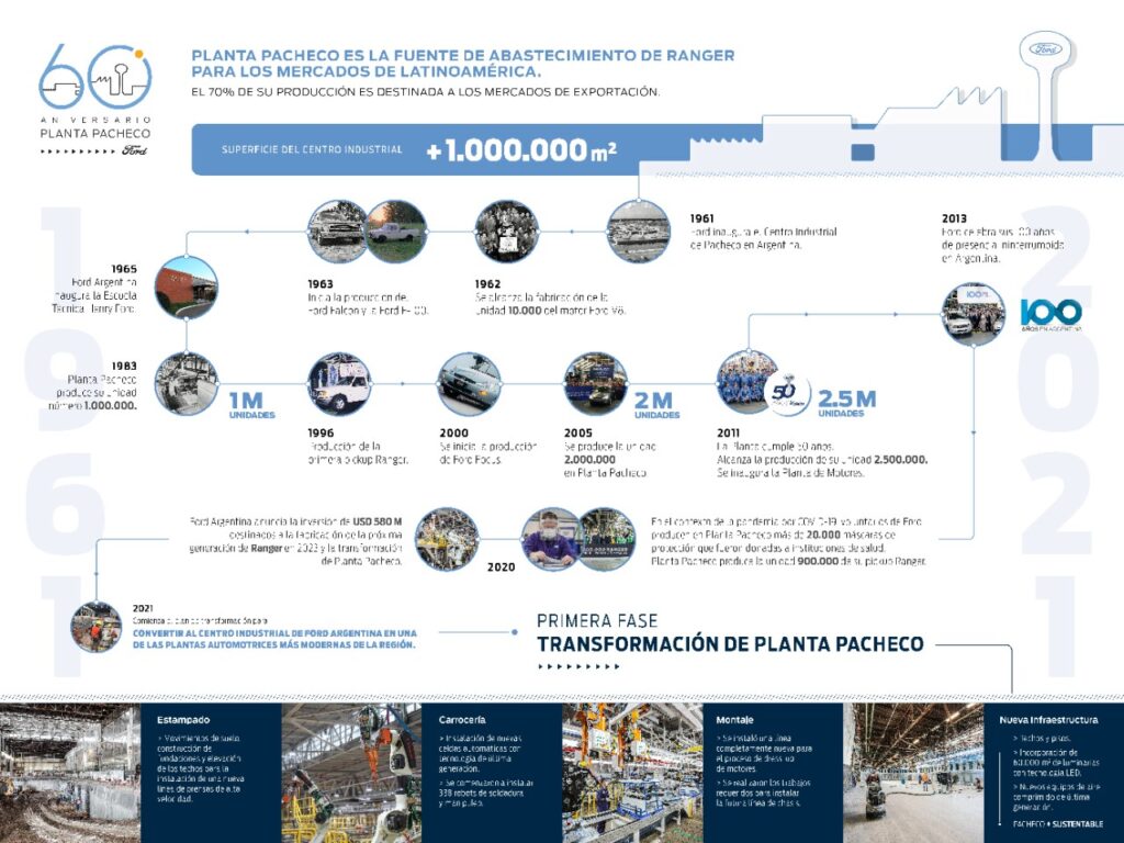 Con más de 107 años de presencia ininterrumpida en el país, Ford Argentina celebra el 60° Aniversario de su Planta Pacheco implementando el plan de inversión de 580 millones de dólares para la fabricación de la próxima generación de Ranger en 2023, la pickup mediana de Ford reconocida por su robustez, tecnología y seguridad. El mismo incluye la modernización integral de su centro industrial y una importante inversión para el desarrollo de autopartes locales. Este aniversario encuentra a Planta Pacheco como el centro industrial más importante de Ford en Sudamérica atravesando una transformación sin precedentes para continuar con la fabricación de productos globales de próxima generación para sus clientes en la región, con alto contenido nacional e incorporando lo último en innovación y tecnología. Planta Pacheco será fuente de abastecimiento de la nueva Ranger para los clientes del óvalo en Latinoamérica en 2023, mercados a los que actualmente destina el 70% de su producción. La historia dice que a finales de la década de 1950, los planes de expansión de Ford en Argentina demandaban mayor capacidad productiva que la ofrecida por la planta de La Boca. Así, el 21 de septiembre de 1961 a 38 kilómetros del centro de Buenos Aires, en un paisaje rural donde hasta ese momento el trazado de la autopista Panamericana solo existía en los tableros de dibujo de los ingenieros, se inauguraba oficialmente el centro industrial de Ford en Pacheco, una importante fábrica de motores y vehículos que rápidamente se convertiría en fuente de producción para Argentina y Latinoamérica. El nuevo complejo productivo protagonizó un papel decisivo en el impulso del progreso no solo de la localidad de General Pacheco -que hoy se erige como uno de los polos industriales más importantes de la Zona Norte del Gran Buenos Aires-, sino del país. Comenzaba en Argentina una etapa de innovación y logros impactantes.