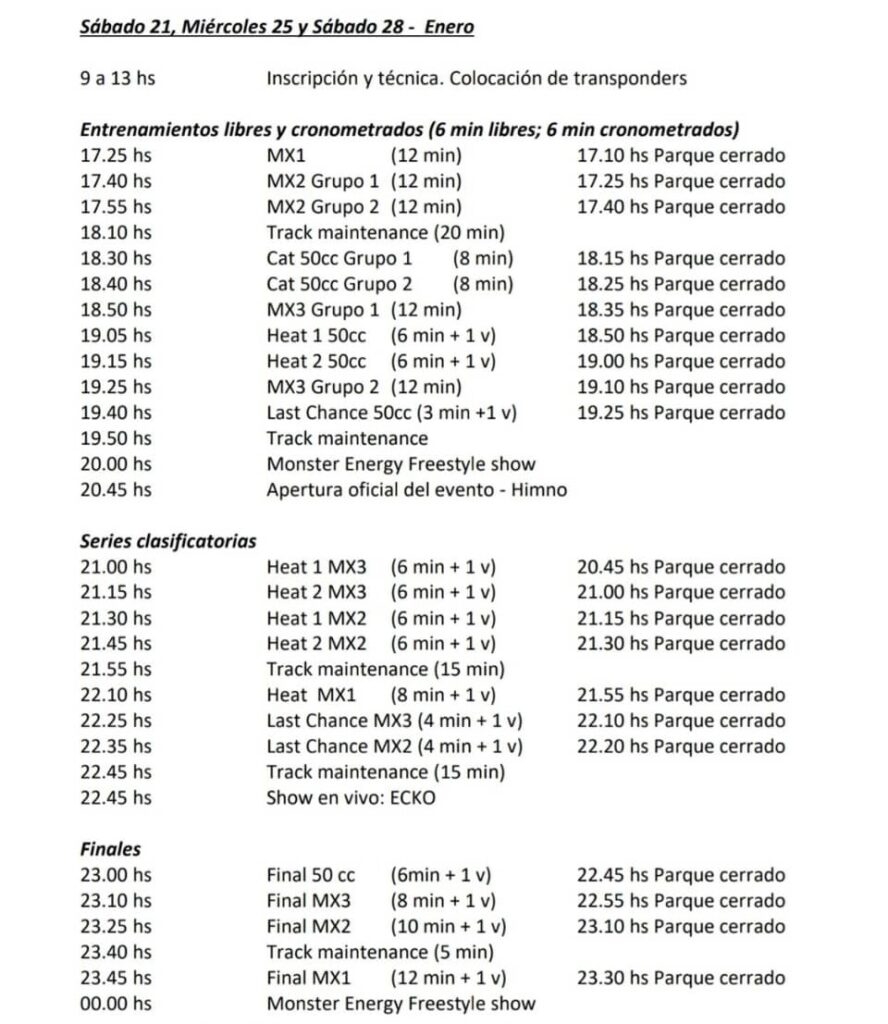 La segunda edición del Campeonato Latinoamericano de Supercross de motociclismo se inicia hoy en la ciudad balnearia de Pinamar, en una competencia que continuará el próximo fin de semana y que atraerá a los máximos exponentes de la especialidad en la región. El evento, denominado Monster Energy SX Champs Series, se realizará en horario nocturno, predominantemente, los días sábado 21, miércoles 25 y sábado 28 de enero. Y se llevará a cabo en una pista emplazada en un predio ubicado en el kilómetro 398,5 de la ruta Nacional número 11. El circuito tendrá 400 metros de extensión. La organización está a cargo de EDV Entertimen S.A, y las pruebas serán fiscalizada por la Federación Internacional de Motociclismo Latinoamericana, en sus cuatro divisionales, MX1 (450 centímetros cúbicos), MX2 (250 cc), MX3 (para más de 35 años), y la Mini 50 cc (para niños de hasta 10 años). El promotor Rodrigo Allúe le dijo a Télam que «tomarán parte 120 corredores de Argentina, Paraguay, Chile, Brasil, Venezuela y Ecuador; todos campeones de Supercross en sus respectivos países». Hoy a partir de las 17.25 se efectuarán los entrenamientos libres para las cuatro clases, de 12 minutos (6 libres y 6 cronometrados), y a las 21.00 comenzarán las series clasificatorias de 6 minutos más una vuelta la MX1 y MX2, 8 minutos más una vuelta la MX3, y después se reducirán a 4 minutos. A las 23.00 empezarán las finales, de 50 cc, a 6 minutos más una vuelta; la MX3, a 8 minutos más una vuelta; la MX2, 10 minutos más una vuelta y la MX1, a 12 minutos más una vuelta. Las tres fechas serán por el Campeonato Latinoamericano y una Súper Final, de las que tomarán parte los mejores 16 del campeonato en un desafío único. (TELAM).