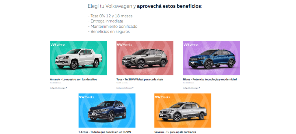 Volkswagen Argentina amplía las condiciones de la nueva campaña llamada “VW Weeks” con una exclusiva financiación a tasa 0% para los modelos Nivus, T-Cross, Taos, Saveiro y Amarok V6. De la mano de Volkswagen Financial Services la marca ofrece, desde el pasado mes de marzo y en todo el territorio nacional, esta novedosa oportunidad para quienes financien la compra de un vehículo 0km a través de toda la red de concesionarios oficiales. Asimismo, junto a la aseguradora Zurich, estos 5 modelos incluyen 6 meses de seguro “todo riesgo” al valor de la cobertura “terceros completo”. A partir de abril la campaña “VW Weeks” continúa mejorando y ampliando las condiciones comerciales para seguir ofreciendo, a todos aquellos interesados en adquirir un Volkswagen, mayor financiación y beneficios exclusivos. Ahora para los modelo Nivus, T-Cross y Saveiro se ofrece Tasa 0% a 12 meses con la posibilidad de financiar hasta $6.500.000. Además tasas que van desde los 9 a 60 meses pudiendo financiar hasta $15.000.000. Exclusivamente para el modelo Taos, de producción nacional, está disponible una Tasa 0% a 12 meses pudiendo financiar ahora hasta $7.000.000. Además tasas que van desde los 9 y hasta los 60 meses, pudiendo financiar hasta $20.000.000. Los clientes interesados en adquirir una Amarok V6 pueden optar por una Tasa 0% a 18 cuotas con un tope de financiación de $12.000.000, o bien por un sistema UVA, también a 18 cuotas, que permite financiar hasta el 50% del valor de la pick up, en cualquiera de sus niveles de equipamiento. Además tasas que van desde los 9 a 60 meses, pudiendo financiar hasta 30 millones. En cuanto al sitio web oficial de la marca, (www.volkswagen.com.ar), este fue completamente actualizado para que la experiencia del usuario sea completa y pueda encontrar todas las opciones que necesite en un mismo lugar. Los interesados podrán configurar el modelo de su interés y encontrar el asesoramiento correspondiente en el concesionario más cercano