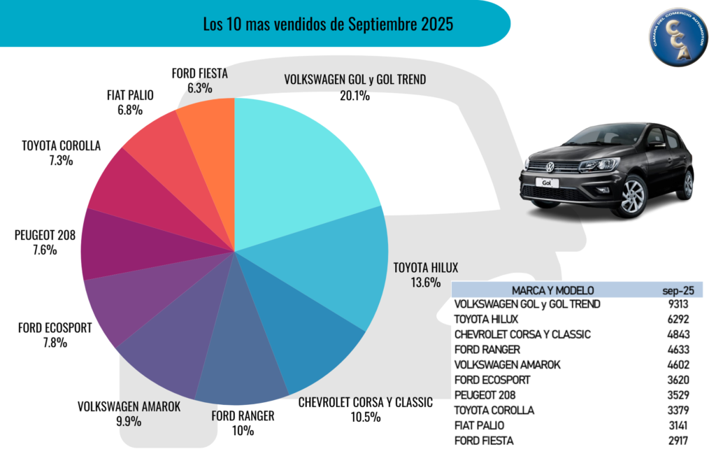 La Cámara del Comercio Automotor (CCA), informó que en el mes de septiembre se comercializaron 171.364 vehículos usados, un 5,45% más que en igual mes de 2024 (162.515 unidades). Si se lo compara con agosto (167.525 unidades), el crecimiento llega al 2,29%. En el período enero-septiembre 2025 se vendieron 1.436.656 unidades, un aumento del 13,84% con respecto a igual período de 2024 (1.262.016 vehículos). Septiembre volvió a mostrar que el Volkswagen Gol sigue encabezando la preferencia de la gente al adquirir un auto usado y de él se comercializaron 9.313 unidades. “Después de un agosto con ventas en baja, septiembre -como ocurrió en abril y en el primer semestre del año- nos sorprendió convirtiéndose en el mejor septiembre desde que se tiene registro, con un volumen superior a las 171.364 unidades”, dijo Alejandro Lamas, secretario de la Cámara del Comercio Automotor quién agregó “Pese a las turbulencias por las que está atravesando la economía, a diferencia del mes pasado, la gente volvió a mostrar interés en la compra de un vehículo, creando un movimiento importante en las agencias del país. Con precios estables y negocios con productos demandados, el mercado tenía que mostrar su fortaleza. El interior sigue empujando al sector, encabezando las ventas Formosa (38,26%), Neuquén (32,64%) y Catamarca (28,81%). Manteniéndose estos volúmenes de venta, estaremos finalizando el año con cifras superiores a 1.800.000 vehículos”.