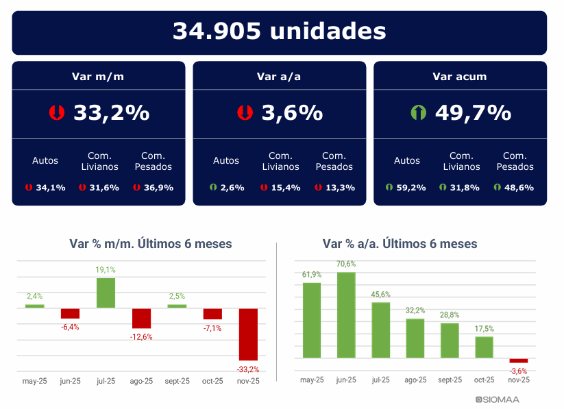 La Asociación de Concesionarios de Automotores de la República Argentina (ACARA) informó que el número de vehículos patentados durante noviembre de 2025 ascendió a 34.905 unidades, lo que representa una baja del 3,6% interanual, ya que en noviembre de 2024 se habían registrado 36.220 unidades. Si la comparación es contra octubre se observa una baja del 33,2% ya que en ese pasado mes se habían registrado 52.259 unidades. De esta forma, en los once meses acumulados del año se patentaron 587.666 unidades, esto es un 49,7% más que en el mismo período de 2024, en el que se habían registrado 392.450 vehículos. De esta manera a falta de un mes de terminar el año, es un hecho que el mercado automotor del 2025 superará las 600.000 unidades patentadas, confirmando una tendencia que se había perfilado ya durante el primer trimestre del año. El presidente de ACARA, Sebastián Beato, comentó «Las casi 35.000 unidades patentadas en noviembre son un buen número, recordemos que tuvimos dos días hábiles menos y que este mes, junto con diciembre, son históricamente los más bajos del año. Vale decir que seguimos con buena actividad en nuestros locales, una tendencia que no parece detenerse de cara a los próximos meses. Esperamos que se avance con los temas laborales e impositivos que se mencionan, que sigamos con crédito a tasas cada vez más convenientes, algo clave para dinamizar nuestro sector, y que la rueda siga girando en 2026, como lo ha venido haciendo durante todo este año, para poder seguir creciendo«.