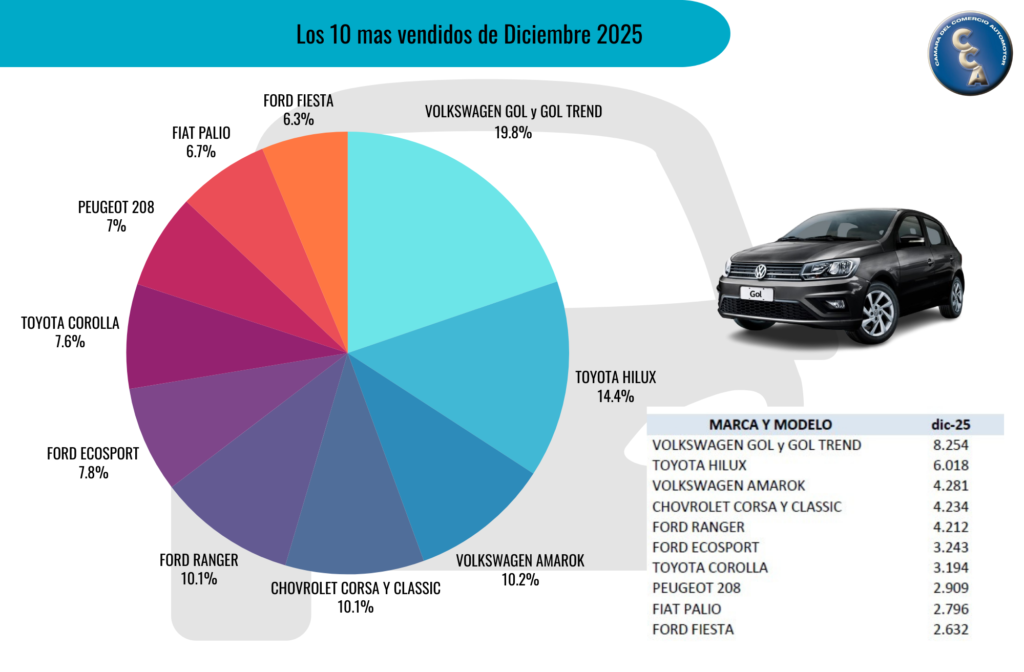 La Cámara del Comercio Automotor (CCA), informó que 2025 registró el récord histórico de venta de autos usados. Se comercializaron 1.887.024 vehículos de ocasión, un 8,12% más que en los doce meses de 2024 (1.745.335 unidades). El anterior récord se había registrado en el año 2013 con 1.855.032 unidades. En diciembre se vendieron 151.994 vehículos, que marcó una baja del 5,32% comparado con diciembre de 2024 (160.539 vehículos). Comparado con noviembre 2025 (132.089 unidades), la suba llegó al 15,07%. El Volkswagen Gol encabezó la preferencia de los usuarios al adquirir un auto usado durante el año pasado del que se comercializaron un total de 104.581 unidades. “El 2025 mostró que el mercado de autos usados está más vivo que nunca. El reacomodamiento de las variables económicas que se llevaron a cabo durante el año impactó en los resultados en el mercado local convirtiendo al 2025 en el año récord histórico de comercialización de autos usados con un volumen de 1.887.024 vehículos” dijo Alberto Príncipe, presidente de la Cámara del Comercio Automotor, quien agregó “El 2026 nos enfrenta a más desafíos. Uno de ellos es trabajar en conjunto con las entidades financieras para poder lograr tasas de financiación adecuadas y en línea para desarrollar las ventas de las unidades, una herramienta fundamental que hoy todavía se encuentra fuera de los valores adecuados. Además, estamos actualizando a nuestro sector a nivel país de herramientas tecnológicas actualizadas tendientes al mejoramiento de la comercialización de los stocks y a la interacción dentro de un sistema tecnológico eficaz. Lograr este objetivo se verá reflejado en un mejor acceso del público a la compra de un auto usado y por ende del crecimiento en el volumen de ventas por parte de las agencias de Argentina. En cuanto a expectativas de ventas en 2026, debemos esperar que transcurra el primer semestre para tener una tendencia sobre como evolucionaran las ventas durante este año”.